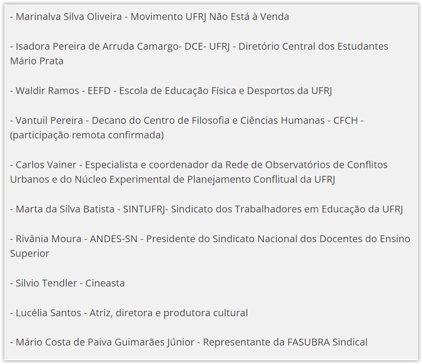 Diante disso, solicitamos uma audiência pública para que as representações de estudantes, técnicos e docentes apresentem suas e nossas preocupações e propostas para garantir que a UFRJ continue sendo uma universidade pública de qualidade e acessível a todos os brasileiros.