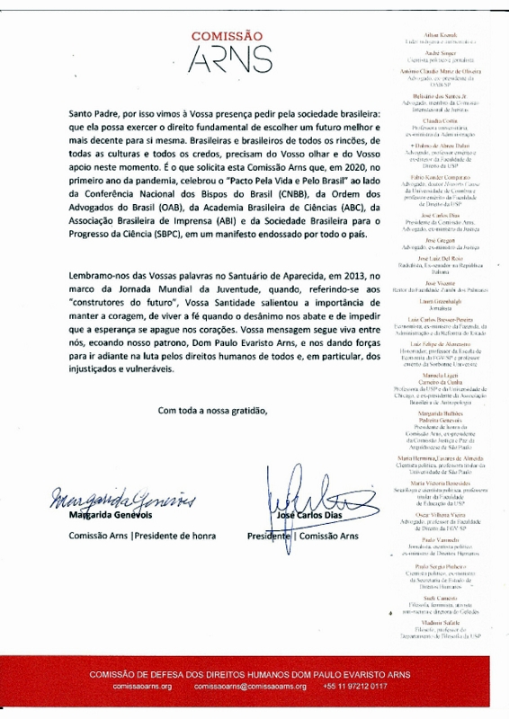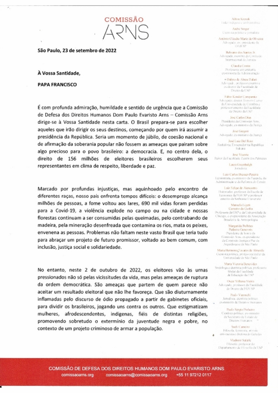 “Santo Padre, por isso vimos à Vossa Presença pedir pela sociedade brasileira: que ela possa exercer o direito fundamental de escolher um futuro melhor e mais decente para si mesma. Brasileiras e brasileiros de todos os rincões, de todas as culturas e de todos os credos, precisam do Vosso olhar e do Vosso apoio neste momento”, solicita a Comissão Arns no documento.