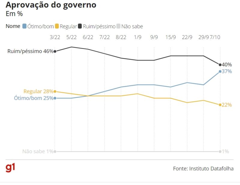 O levantamento mais recente do instituto que aferiu a taxa de aprovação foi divulgado em 29 de setembro. Ele apontou que o presidente tinha 44% de avaliações negativas (ruim ou péssimo) e 31% de avaliações positivas (ótimo ou bom). Os que consideravam a gestão regular eram 22%.