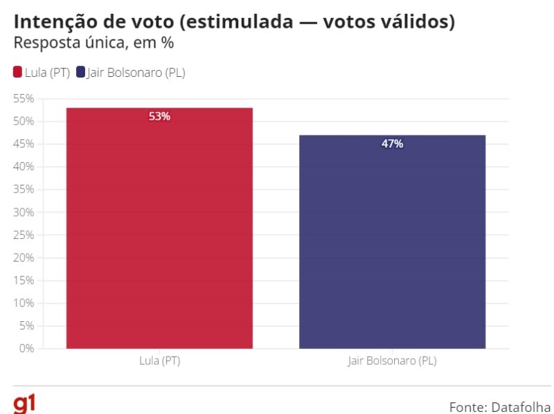 Nos votos válidos, o levantamento apontou que Lula tem 53%, e Bolsonaro, 47% (veja infográfico abaixo).