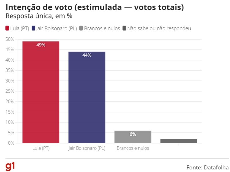Pesquisa Datafolha divulgada nesta sexta-feira (7), encomendada pela Globo e pela “Folha de S.Paulo”, aponta que o ex-presidente Luiz Inácio Lula da Silva (PT) tem 49% de intenção de votos no segundo turno e que o presidente Jair Bolsonaro (PL) tem 44%. Este é o primeiro levantamento do instituto feito após o primeiro turno das eleições.