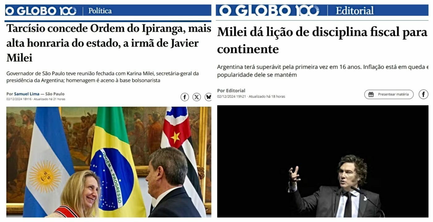 O governador Tarcísio homenageia a irmã de Milei. O Globo faz editorial elogiando o próprio por sua política econômica.