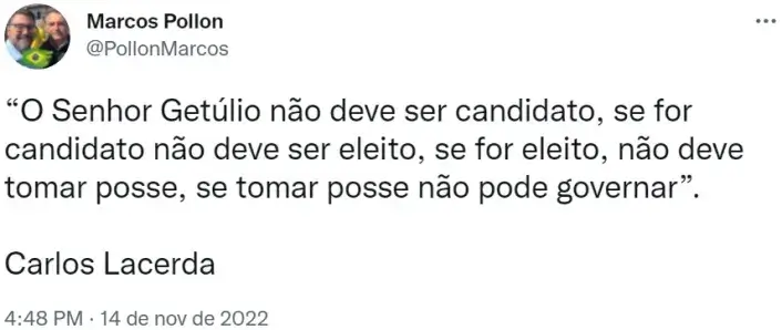 Duas semanas depois, no dia 14 de novembro de 2022, Marcos Pollon resolveu dispensar, ou quase, os rodeios. Naquele dia, Pollon reproduziu no ex-Twitter a famosa declaração de guerra de Carlos Lacerda publicada em 1950 na Tribuna da Imprensa: