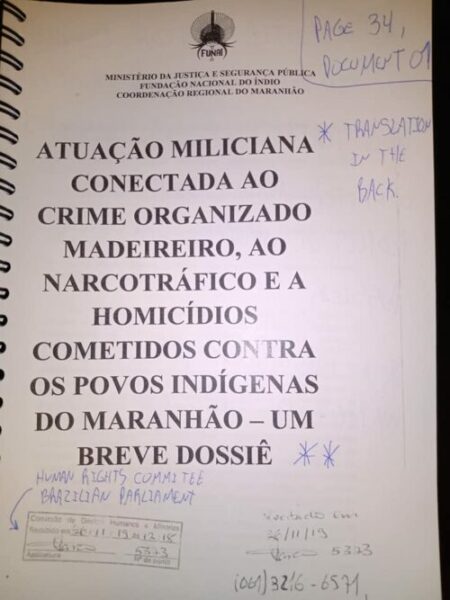 No dia 25 de novembro de 2019, Ricardo Henrique Rao, indigenista especializado da Fundação Nacional do Índio (Funai), entregou à Comissão de Direitos Humanos e Minorias, da Câmara dos Deputados, um documento intitulado “Atuação miliciana conectada ao crime organizado madeireiro, ao narcotráfico e a homicídios cometidos contra os povos indígenas do Maranhão – Um breve dossiê”.