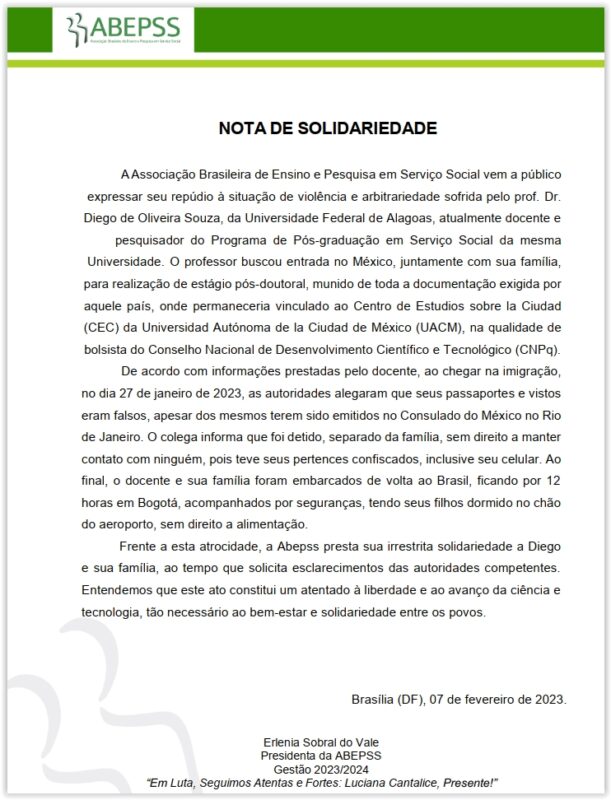Nós, professores/as, técnico-administrativos e estudantes do  PROGRAMA DE PÓS-GRADUAÇÃO EM ENSINO E FORMAÇÃO DE PROFESSORES – PPGEFOP UFAL/ARAPIRACA vimos através deste manifesto prestar nossa solidariedade e apoio incondicional ao professor Dr. DIEGO DE OLIVEIRA SOUZA, que no dia 27 de janeiro de 2023 sofreu situação desumana, com detenção, negação de comunicação e separação da família, sua esposa, filhos pequenos e sogra, no Aeroporto Benito Juárez, Cidade do México, sendo então deportado ao Brasil quando se dirigia a Universidad Autónoma de la Ciudad de México (UACM) para estudos de Pós-Doutoramento financiados pelo CNPq – Conselho Nacional de Desenvolvimento Científico e Tecnológico (CNPq).