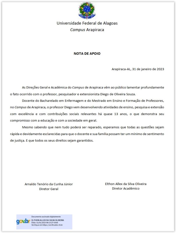 Diante do ocorrido lamentável, a Adufal informa que está acompanhando de perto os desdobramentos do caso e manifesta seu apoio ao professor Diego de Oliveira Souza, esperando que tudo seja resolvido da melhor forma.