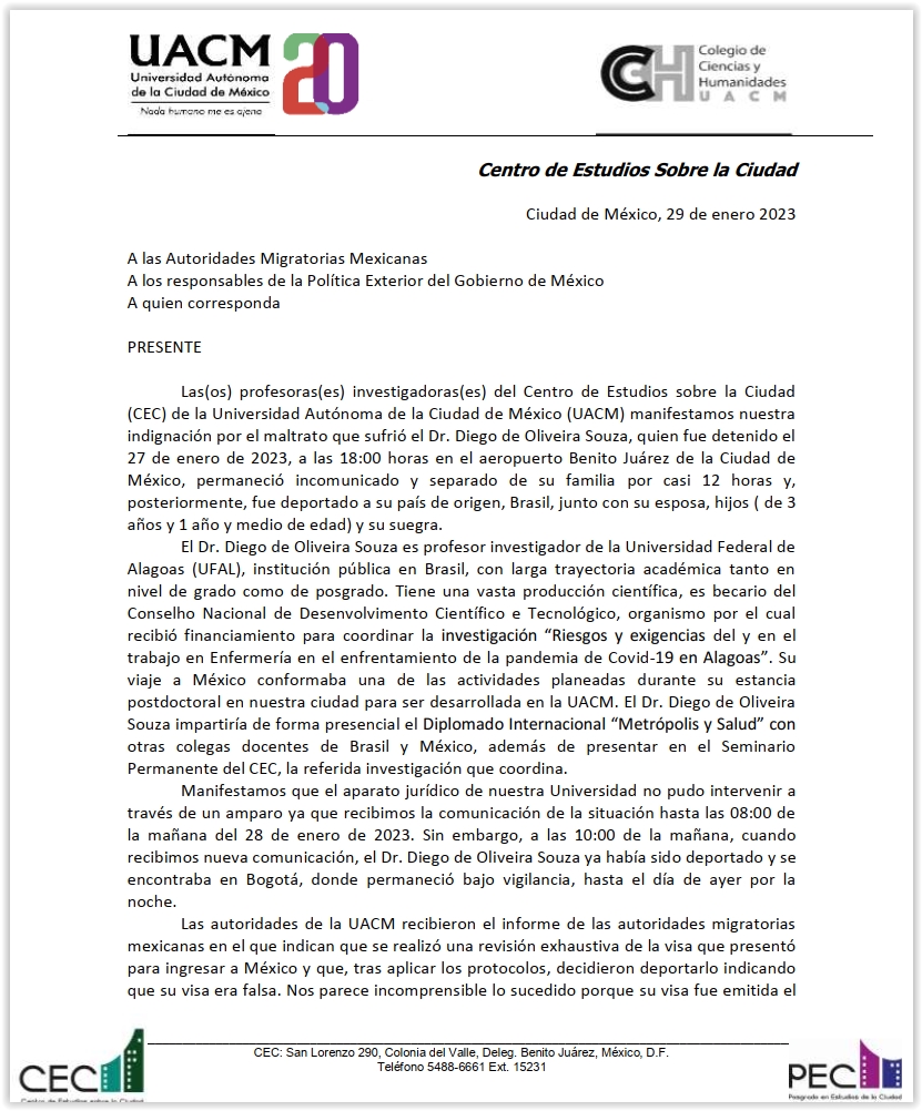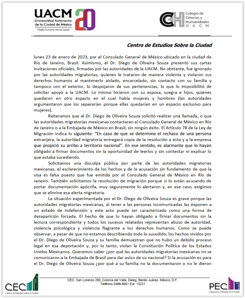 Professores e pesquisadores do Centro de Estudos da Cidade (CEC) divulgaram nota pública (na íntegra, abaixo) em defesa do professor Diego e repúdio às autoridades migratórias do México. Também fizeram um abaixo-assinado online.
