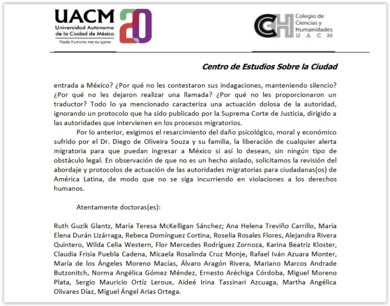 Por todo o exposto, entendemos que é urgente que o governo mexicano, como decisão soberana de uma nação irmã, apresente uma explicação razoável para o ocorrido ao Professor Dr. Diego Souza e sua família. Assim o fazendo, fará bem a todo povo brasileiro na medida em que reiterará os laços inquebráveis que une toda a América Latina e permitirá que este grave incidente seja superado.