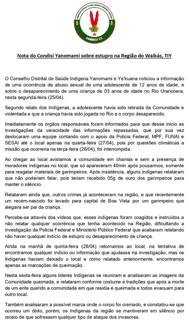 Terça-feira pela manhã, 26-04. O Condisi-YY enviou ofícios à Polícia Federal, Ministério Público Federal, Funai e Ministério da Saúde, pedindo investigação do caso.