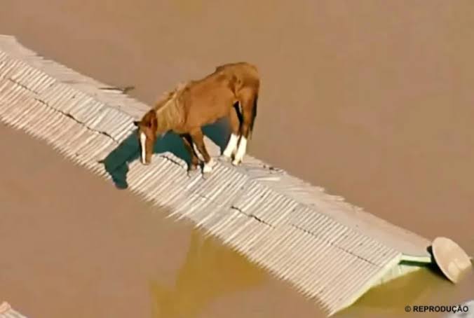 não se sabe por quanto tempo ele lutou contra aquelas furiosas águas barrentas, até fazer do telhado o seu estábulo.